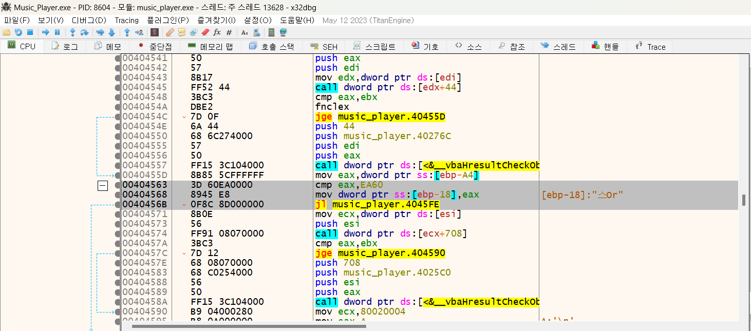 만약 재생했던 시간이 60000밀리 초보다 클 경우 점프하지 않고(JL은 결과가 작을 경우 점프한다.) 더 이상의 재생을 막는 루틴으로 실행 흐름이 넘어간다.
