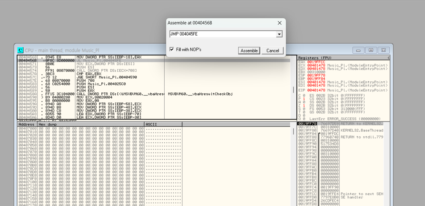 JL을 무조건 점프할 수 있도록 JMP로 수정했다.
