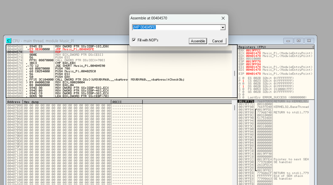 "004046B9"에서 "vbaHresultCheckObj() 함수"를 호출하려다 에러가 발생했다.